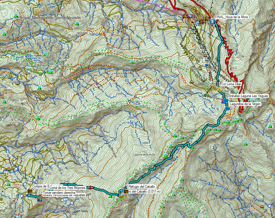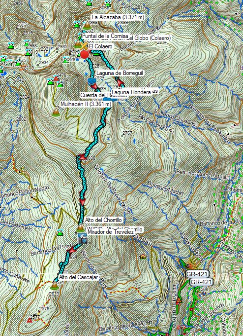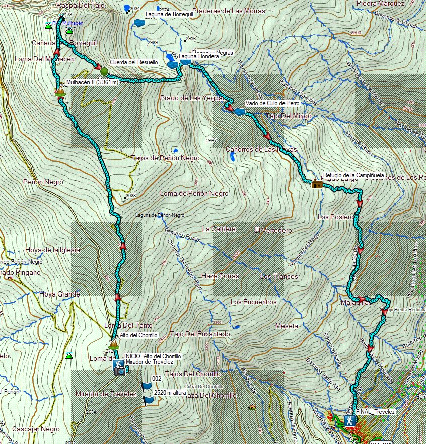 El camino inicial es similar a la ruta a la Alcazaba, incluso de vuelta visitamos de nuevo para la Laguna Hondera, pero el retorno como se hace en modo travesía consiste en una larga bajada hasta Trévelez, se trata de casi 2.000 m descendiendo pasando antes por el refugio de Campiñuela. Trevélez forma parte del Parque Natural de Sierra Nevada, y se ubica en su vertiente norte. A una altitud de 1.476 m se trata de uno de los pueblos más altos de España bajo las laderas del Mulhacén.