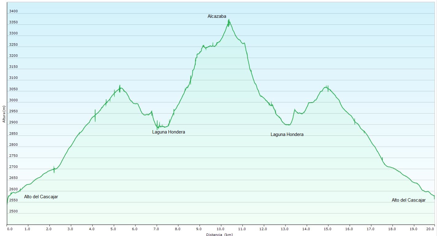Queda propiamente el ascenso a la Alcazaba donde emprendemos una ruta circular. Se cruza el desagüe de la Laguna Hondera hacia la Loma de Culo Perro y se asciende en dirección noroeste hacia el Peñón del Globo. En el tramo final el sendero rodea la cumbre del Peñón por su cara norte hasta el Paso del Peñón del Globo ("Colaero"). Solo queda media hora de marcha a cima.