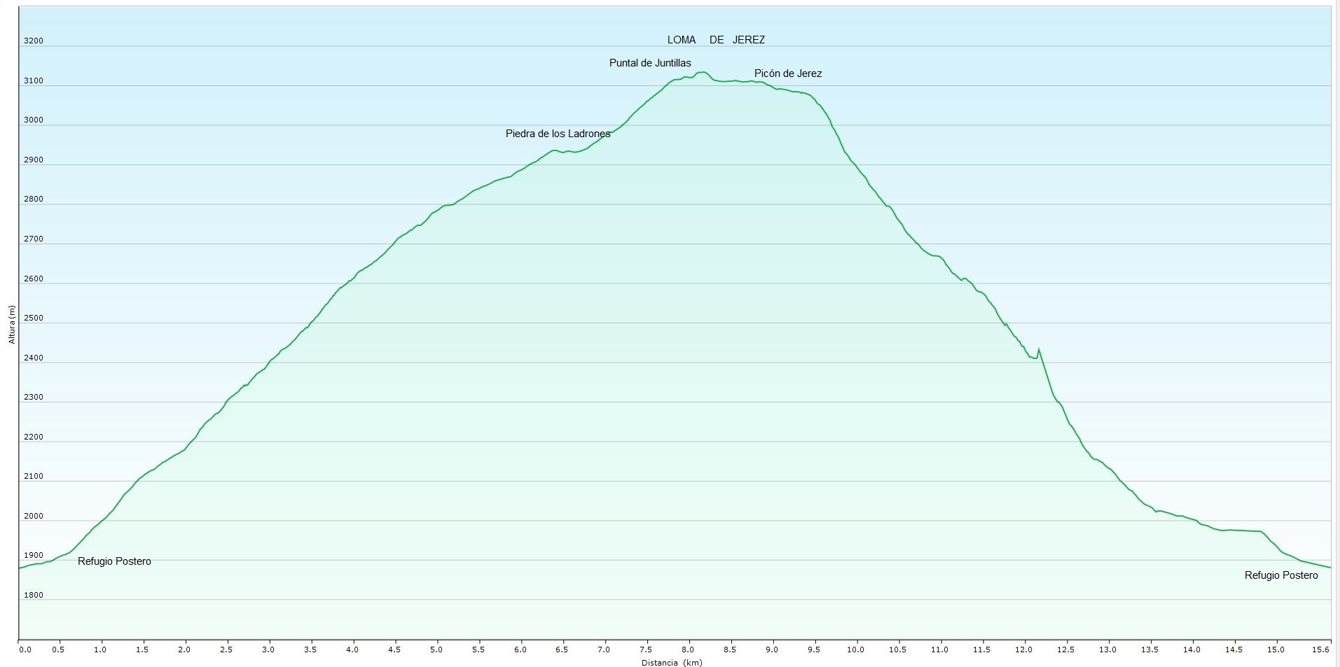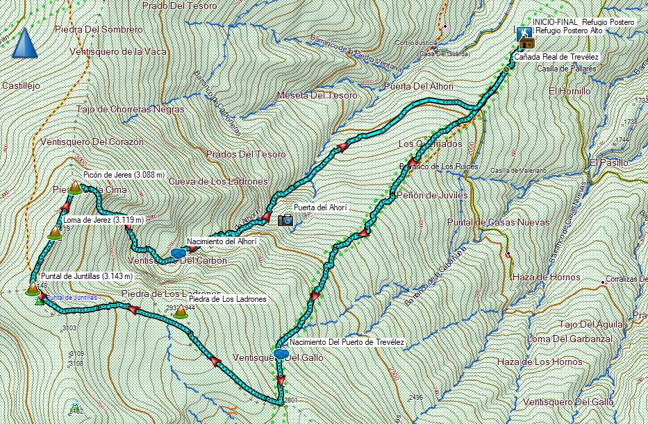 Una vez allí, giramos a la dcha. para seguir la cresta hasta alcanzar la Piedra de los Ladrones. Nos restan 100 m de desnivel hasta el siguiente tramo con dirección al Puntal de Juntillas, aquí mantenemos la ruta siguiendo los hitos por una senda intermitente. Al alcanzar la cumbre divisamos la espectacular panorámica de toda la línea de “tresmiles”. En el tramo final de la ascensión debemos seguir con dirección N hasta el Picón de Jérez, alcanzando finalmente el vértice geodésico.
