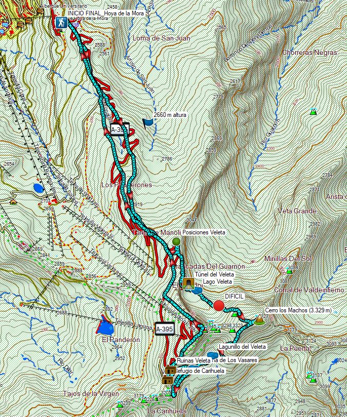 El descenso continúa por la loma del cerro por una pedrera de grava fina hasta la pista que conecta los refugios de la Caldera y la Carihuela. La pista nos conduce en suave ascenso por los Vasares del Veleta hasta alcanzar al Refugio de la Carihuela (3.201 m). El último tramo consiste en la ascensión final al Pico Veleta. El sendero pasa por las ruinas de una antigua construcción y alcanza la cota del telesilla de La Laguna, el más alto de la península a 3.300 m. Para el regreso, seguimos el sendero normal de bajada, bien marcado y vertical, optando por las variantes a izda. en las bifurcaciones que se nos presenten, hasta retornar poniendo fin a la ruta en Hoya de la Mora.
