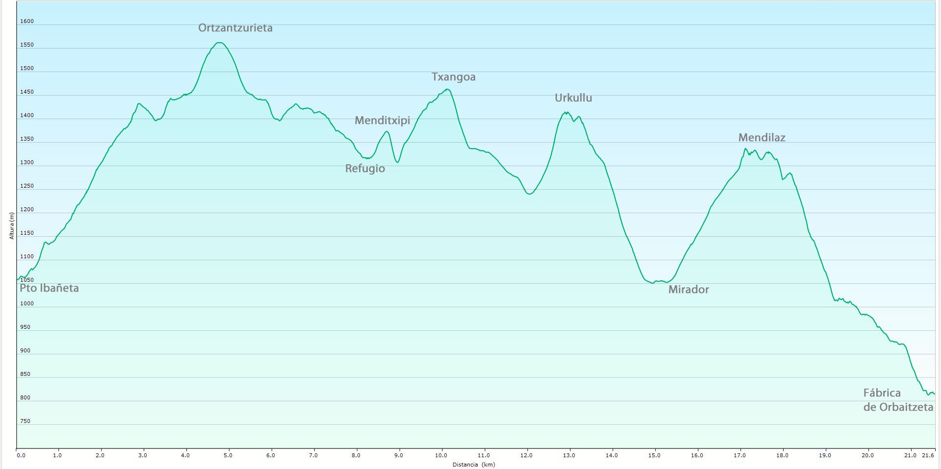 Se sale del Alto de Ibañeta y al inicio se va cruzando las zetas de la pista/carretera (GR 65 / NA 2033) que servía para el mantenimiento de la desaparecida antena de Ortzantzurieta. En la subida se observa algún bunker que data de la guerra civil. Cuando se llega al cruce con el “Camino de Santiago Francés” se gira a la dcha. para subir y bajar por la misma senda al Ortzantzurieta, primera cumbre del recorrido, la más alta de la divisoria de aguas superando en altura a cimas como Gorbeia (1481 m) o Aizkorri (1528 m). Para encontrar una más alta, hay que ir hasta los montes del Pas entre Burgos y Cantabria. Las vistas de 360º son impresionantes. Descendemos y se gira hacia el collado de Lepoeder en el Camino Francés. Seguido nos dirigimos hacia Menditxipi y después subimos a Txangoa con vistas hacia el Pirineo. A la bajada giramos a la derecha hacia el collado de Arnostegui a los pies del Urkulu. En la bajada cruzamos el camino de Azpegui para dirigirnos hacia Mendilatz y después bajar por senda en ladera hacia la Fábrica de Armas de Orbaitzeta donde nos recogerá el autobús.